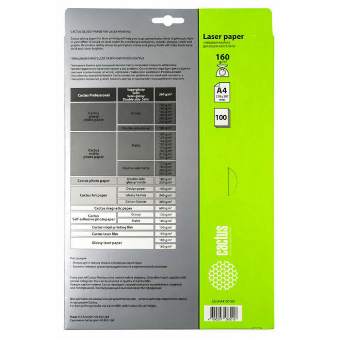 Купить Фотобумага Cactus CS-LPA4160100, A4, для лазерной печати, 100л, 160г/м2, белый, покрытие глянцевое