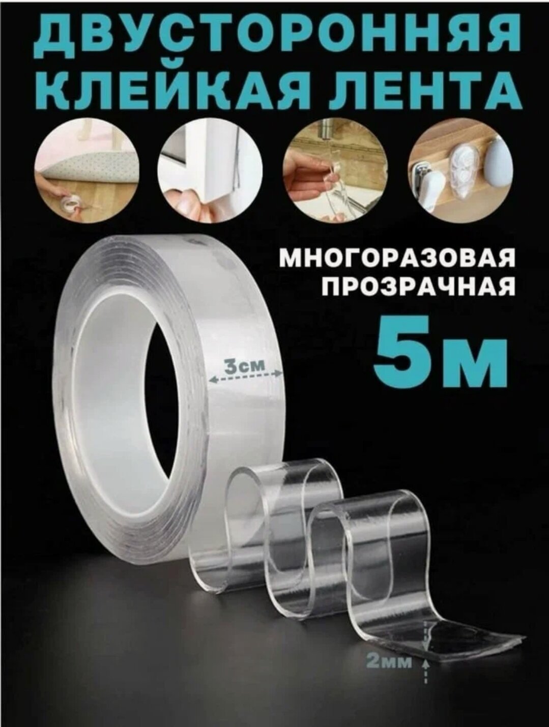 Лента клейкая крепежная двухсторонняя многоразовая прозрачная, 2мм x 3см x 3м