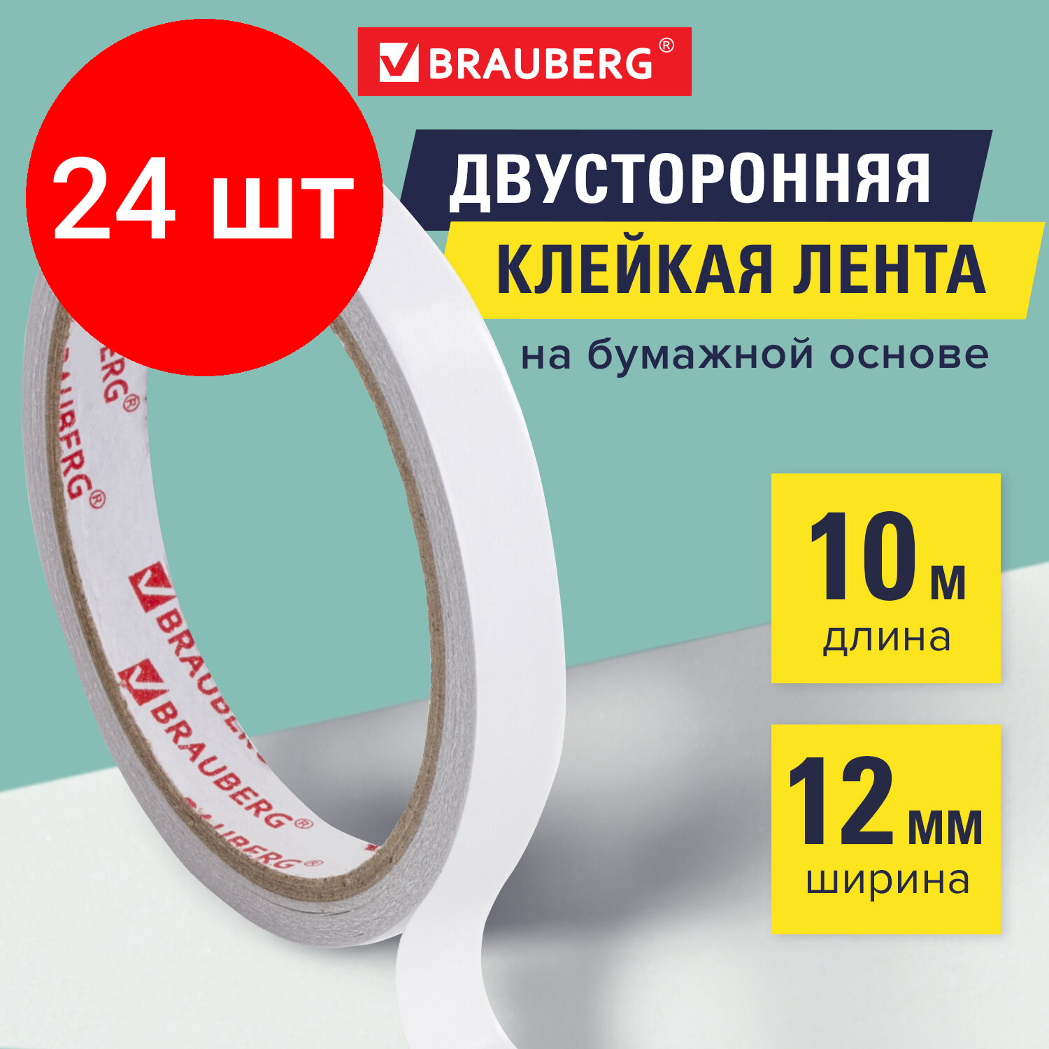 Купить Комплект 24 шт, Клейкая двухсторонняя лента 12 мм х 10 м, бумажная основа, BRAUBERG, 227267
