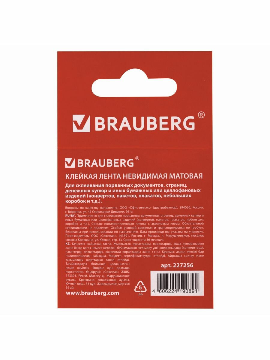 Клейкая лента невидимая, матовая, 12 мм х 33 м, BRAUBERG, 227256 Комплект : 1 шт .