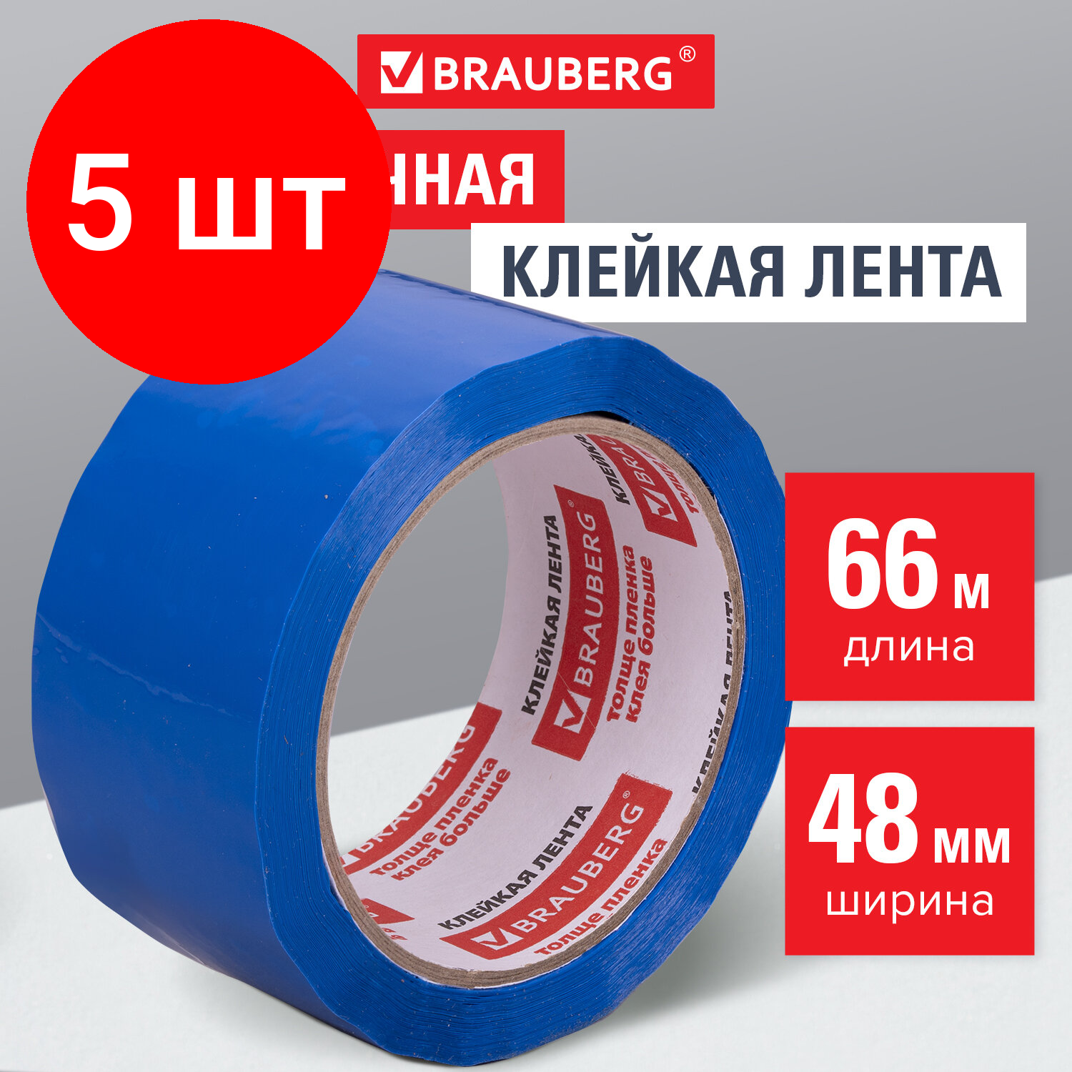 Купить Комплект 5 шт, Клейкая лента упаковочная, 48 мм х 66 м, синяя, толщина 45 микрон, BRAUBERG, 440076