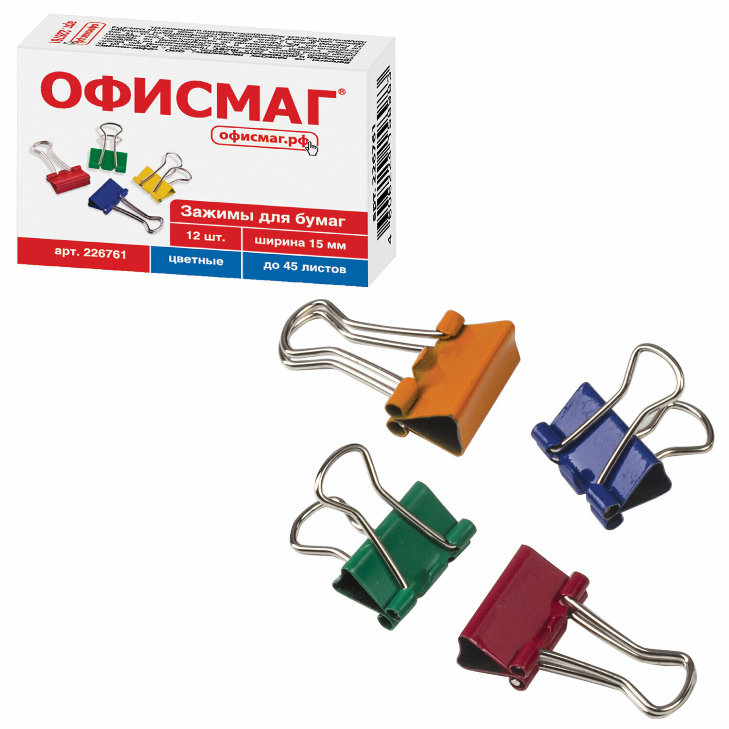 Зажимы для бумаг офисмаг, комплект 12 шт., 15 мм, на 45 листов, цветные, картонная коробка, 226761 (цена за 1 шт.)
