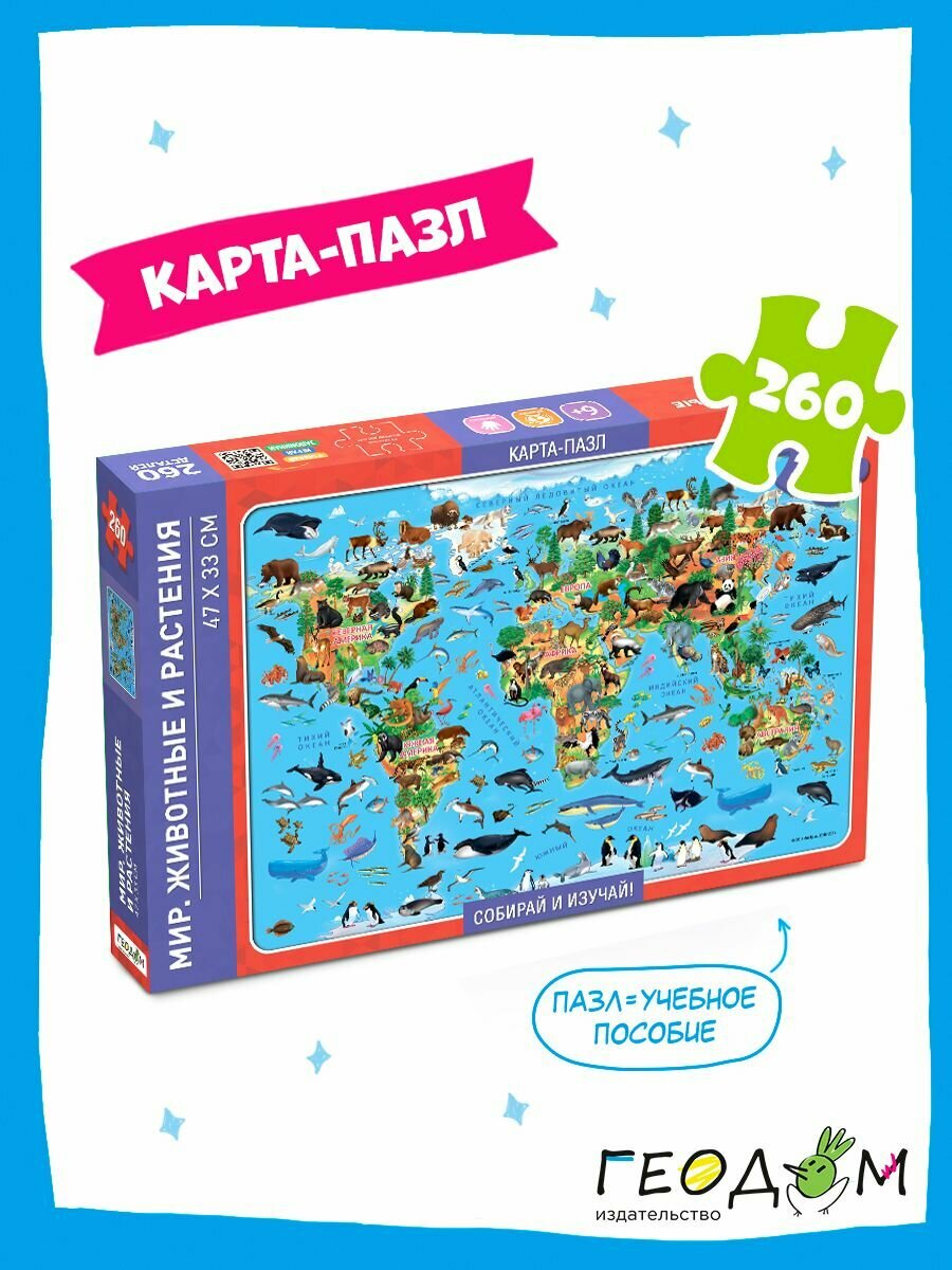Карта-пазл. Мир-животные и растения. 260 дет. 33х47 см. геодом