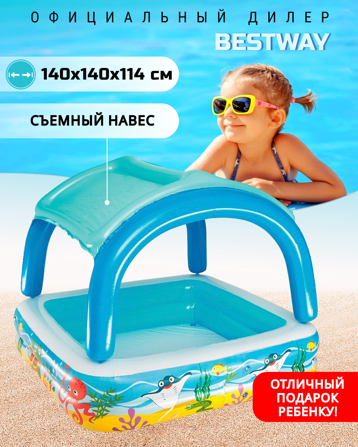 Детский надувной бассейн BESTWAY 140х140х114см со съемным навесом, 265л, от 2 лет, 52192