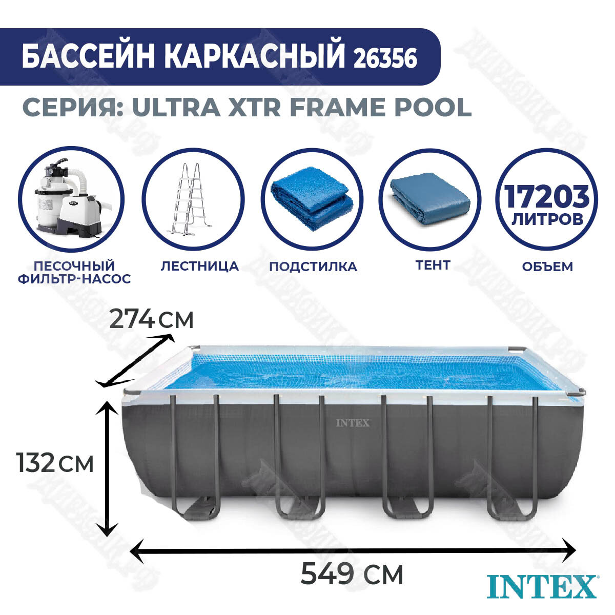 Бассейн INTEX ULTRA XTR RECTANGULAR FRAME, 549x274x132см, фильтр-насос песчаный 4,5м?, лестница, подстилка, тент Объем: 17203л
