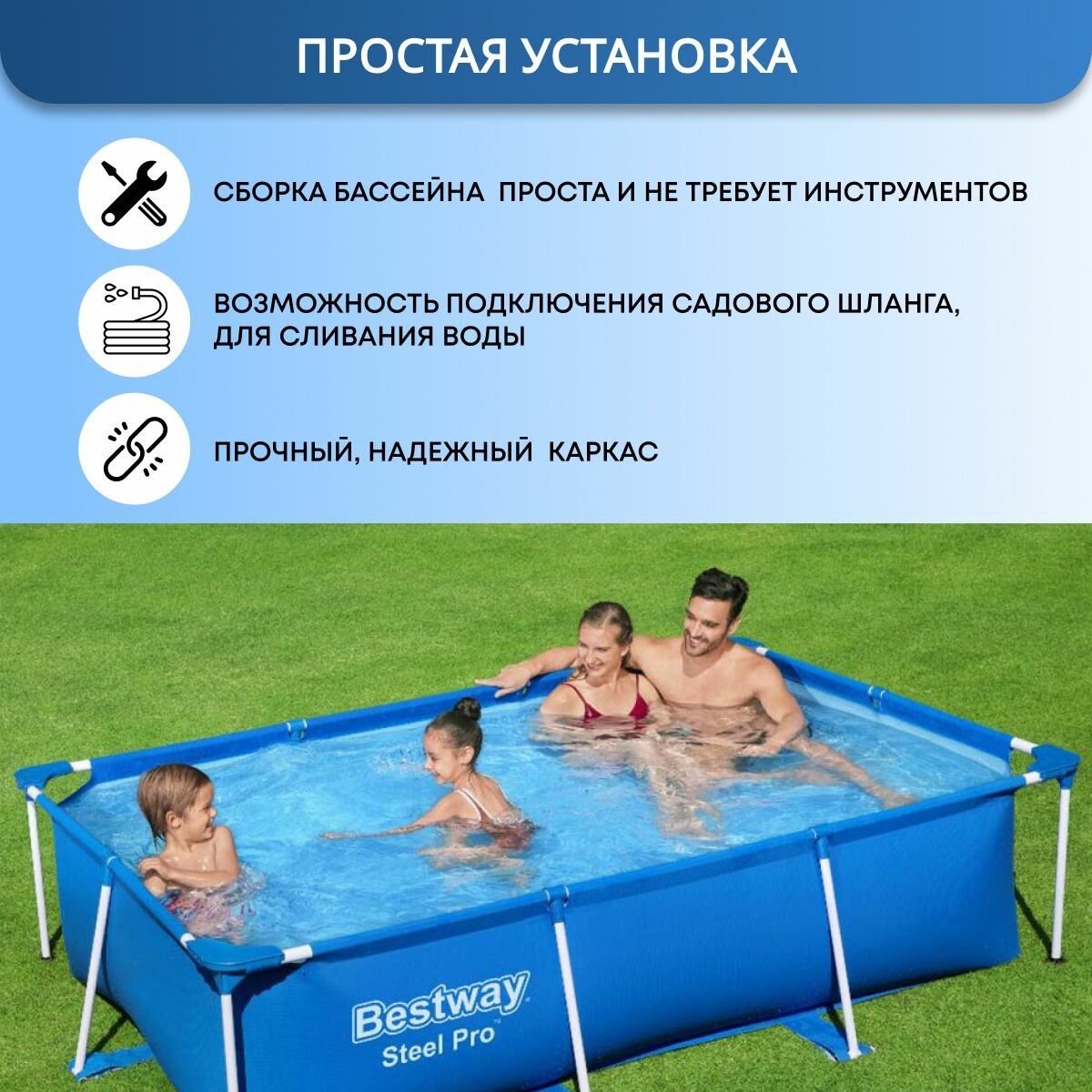 Бассейн каркасный прямоугольный 3300л 300х201 h66см 3 слоя металлический каркас, сливной клапан