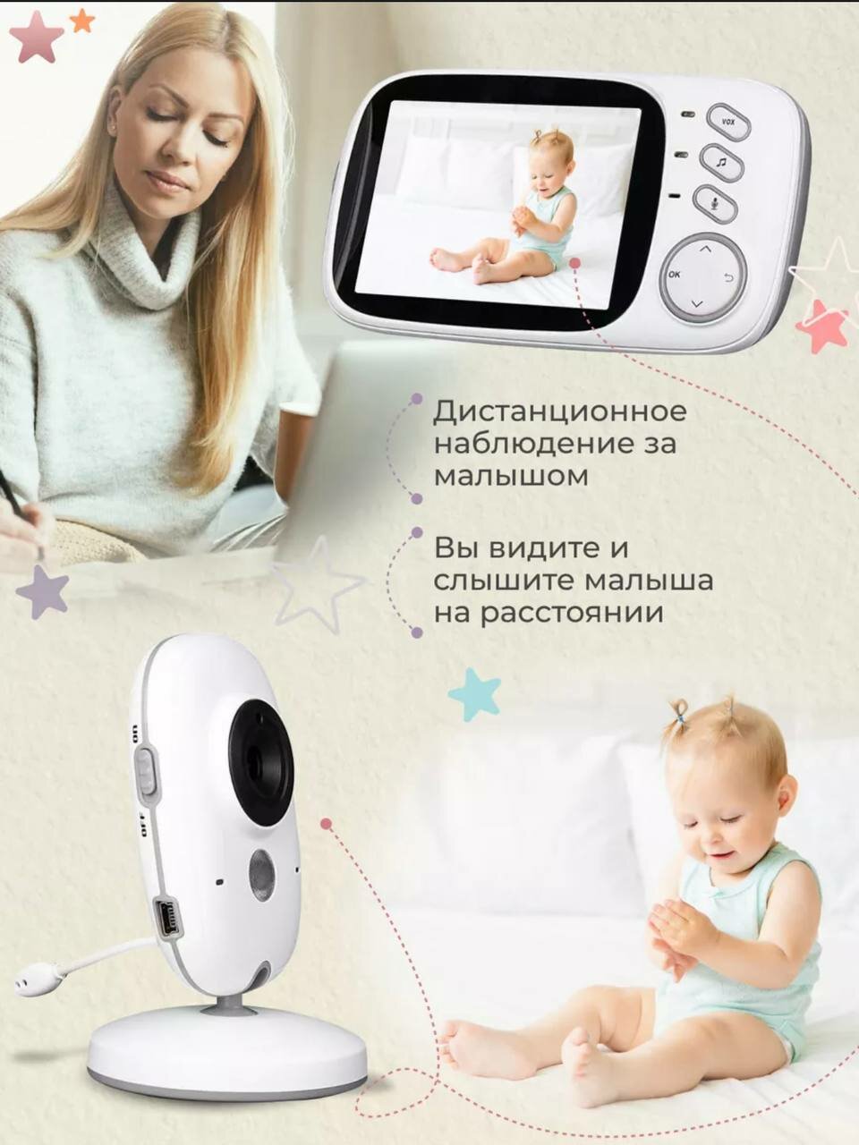 | Особенности | ночник, термометр, функция ночного видения, голосовая активация (VOX), колыбельные мелодии, двусторонняя голосовая связь |