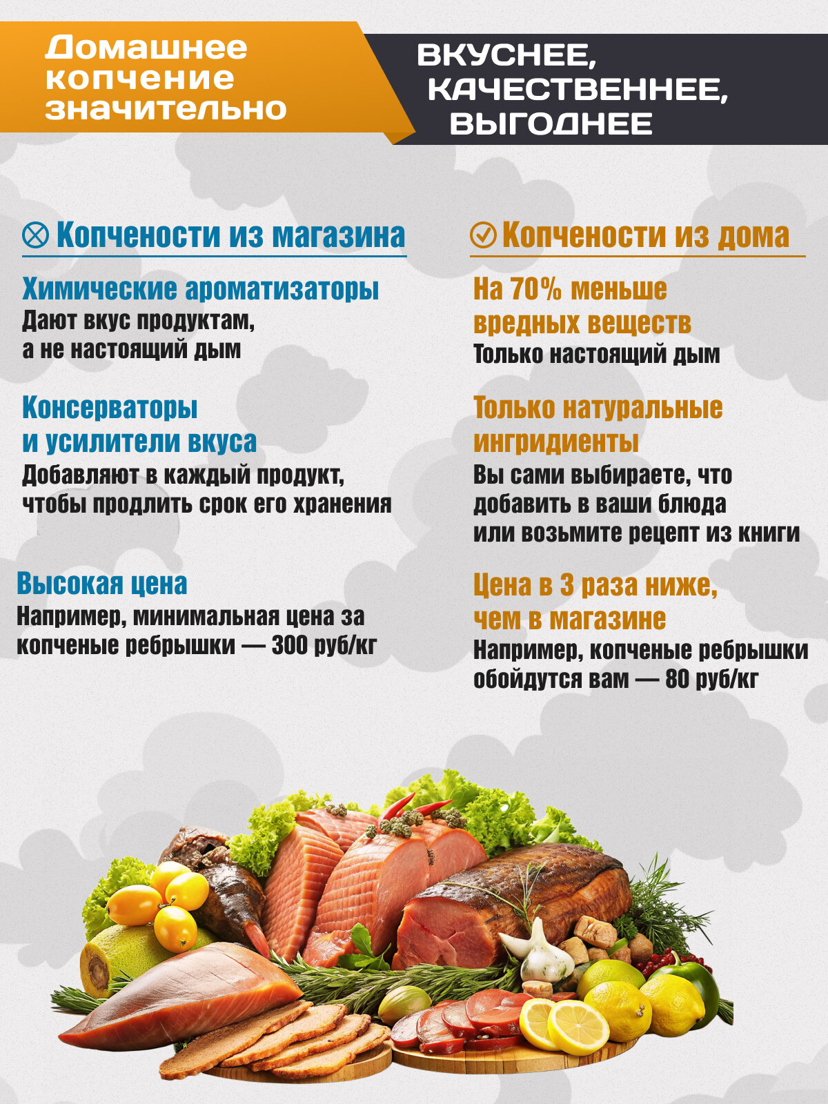 | Дополнительная информация | температура обработки 19-40°С; толщина дна 1 мм; объем емкости для копчения 50 л; объем отсека для щепы 3.5 л |