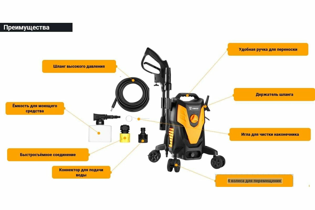 | Подробная комплектация | мойка высокого давления DEKO DKCW170 PRO, пистолет, шланг высокого давления, насадка-распылитель, насадка-щетка, емкость для моющих средств |