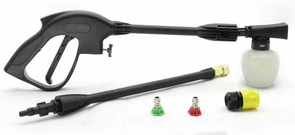 | Подробная комплектация | мойка высокого давления, длинная ручка, шланг высокого давления, моечный пистолет G08, 2 насадки-сопло, бачок для моющего средства, переходник для шланга 1/2, кронштейн, держатель пистолета, комплект крепежа, игла для прочистки сопла, адаптер-фильтр для входного шланга, насадка-удлинитель |