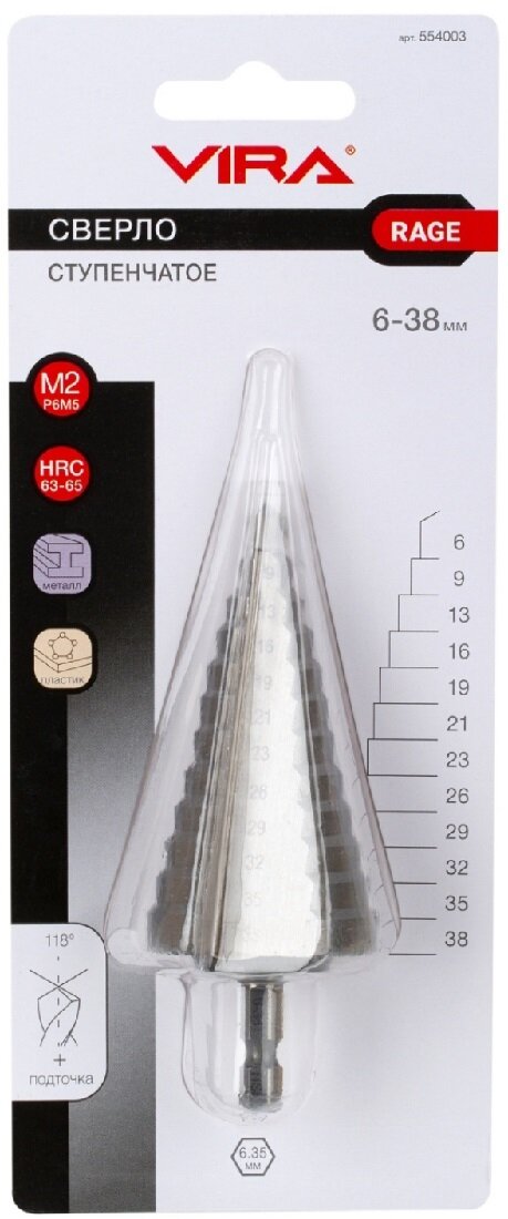 Купить Vira Rage Сверло ступенчатое с шестигранным хвостовиком 6-38 мм 554003 .