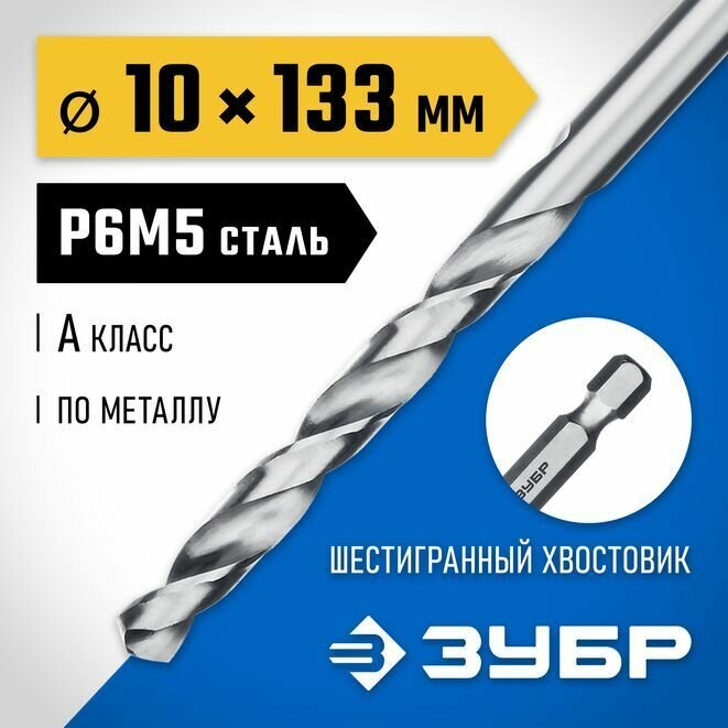 Купить Сверло спиральное по металлу Профессионал, ЗУБР 10 x 133 мм, НЕХ 1/4", сталь Р6М5, класс А1