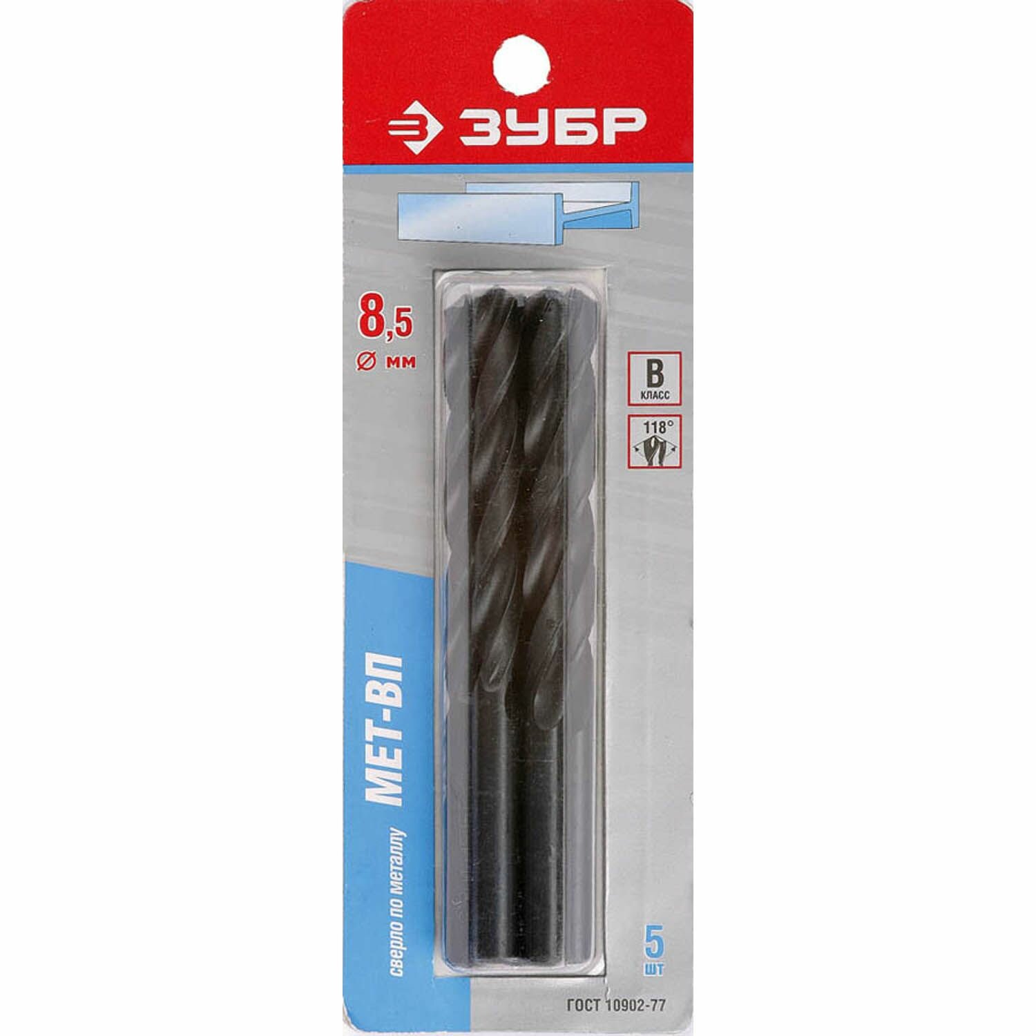 Сверло ЗУБР ″МЕТ-ВП″ по металлу парооксидированное, быстрорежущая сталь, 8,5х117мм, 5шт (4-29605-117-8.5-K5)