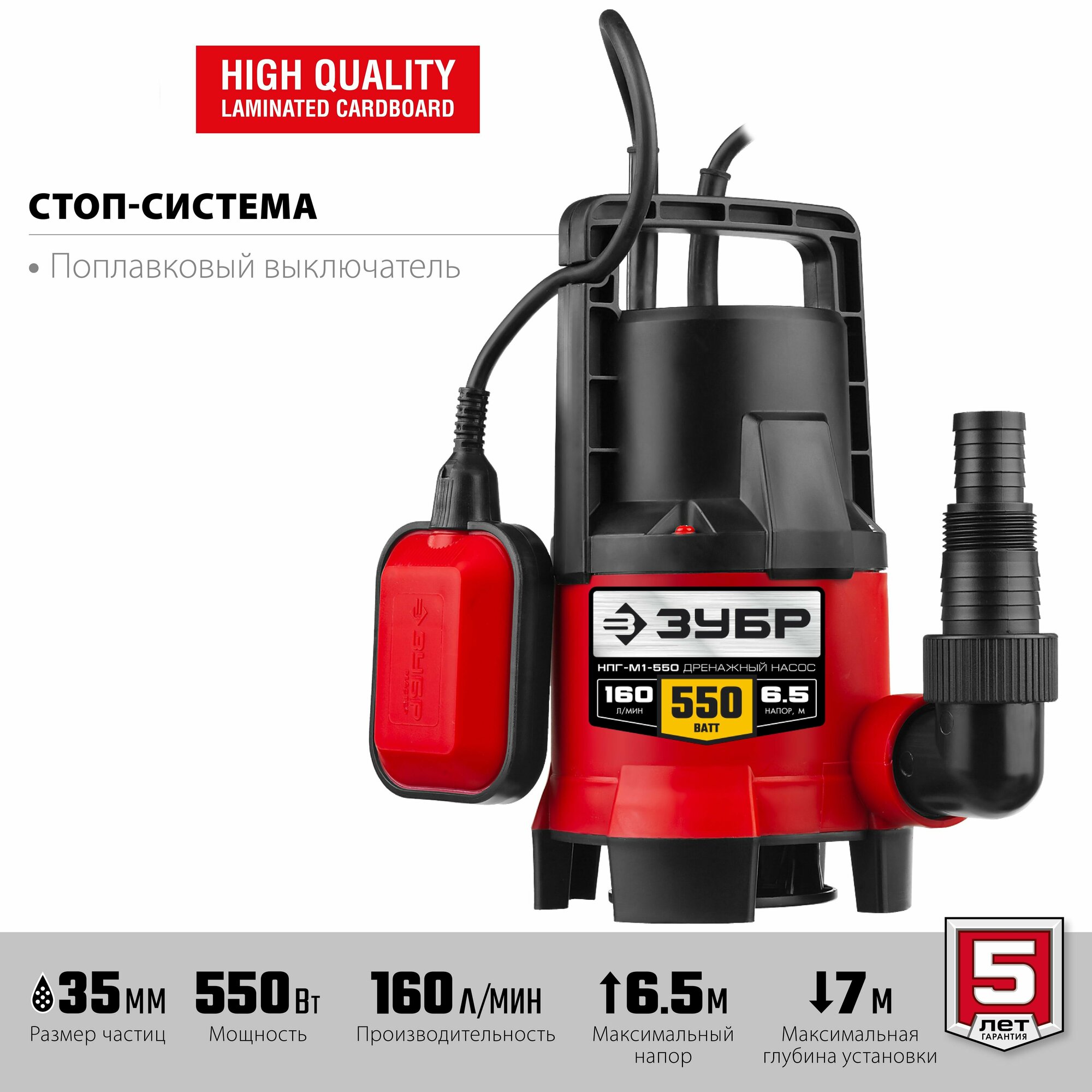 ЗУБР Насос М1 погружной, ЗУБР НПГ-М1-550, дренажн для грязн воды (d частиц до 35 мм), 550Вт, пропускн способность 160л/мин, напор 6.5м, провод 7м, ( НПГ-М1-550 )