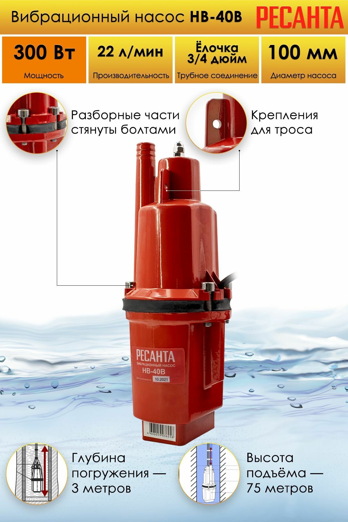 Вибрационный насос Ресанта НВ-40В, высота подъема 75м, верхний забор воды, кабель 40м