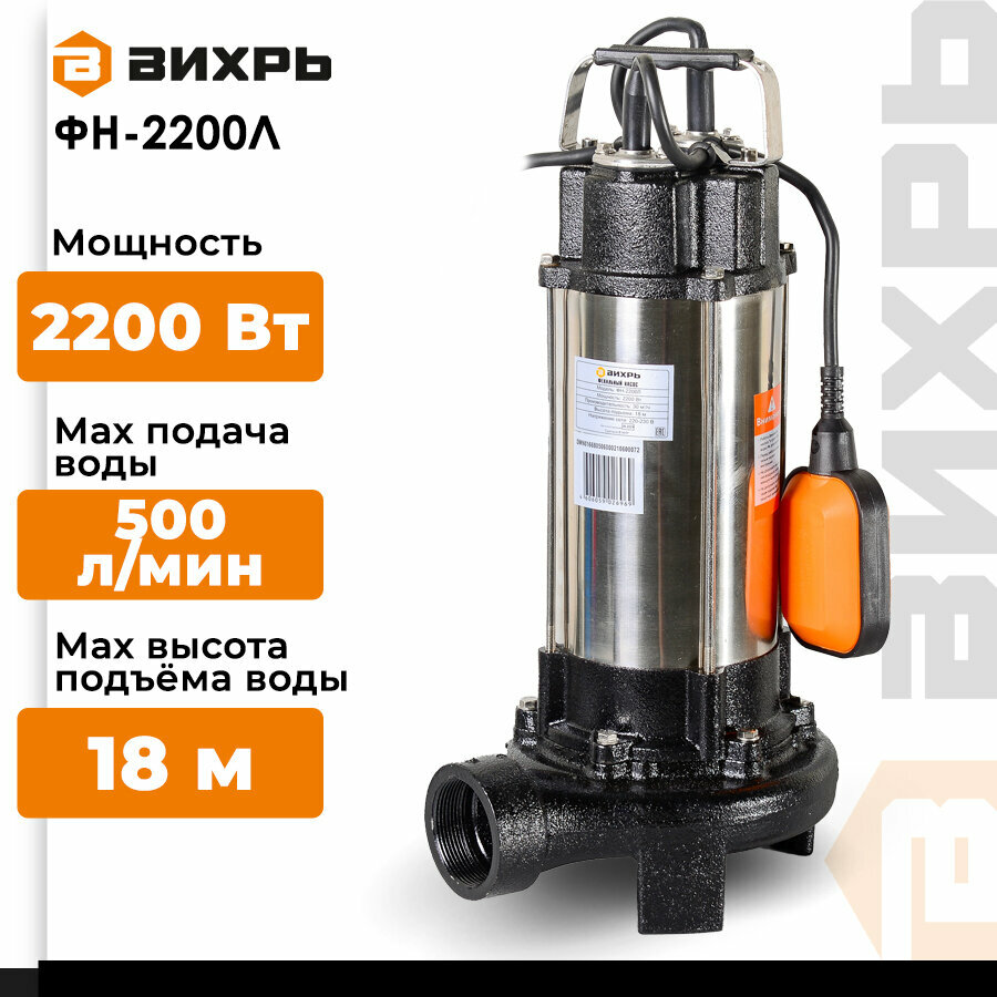 Фекальный насос Вихрь ФН-2200Л (производительность - 30000 л/ч,нож-лезвие, мощность 2200Вт, глубина погружения 9м, высота подъема 18м)