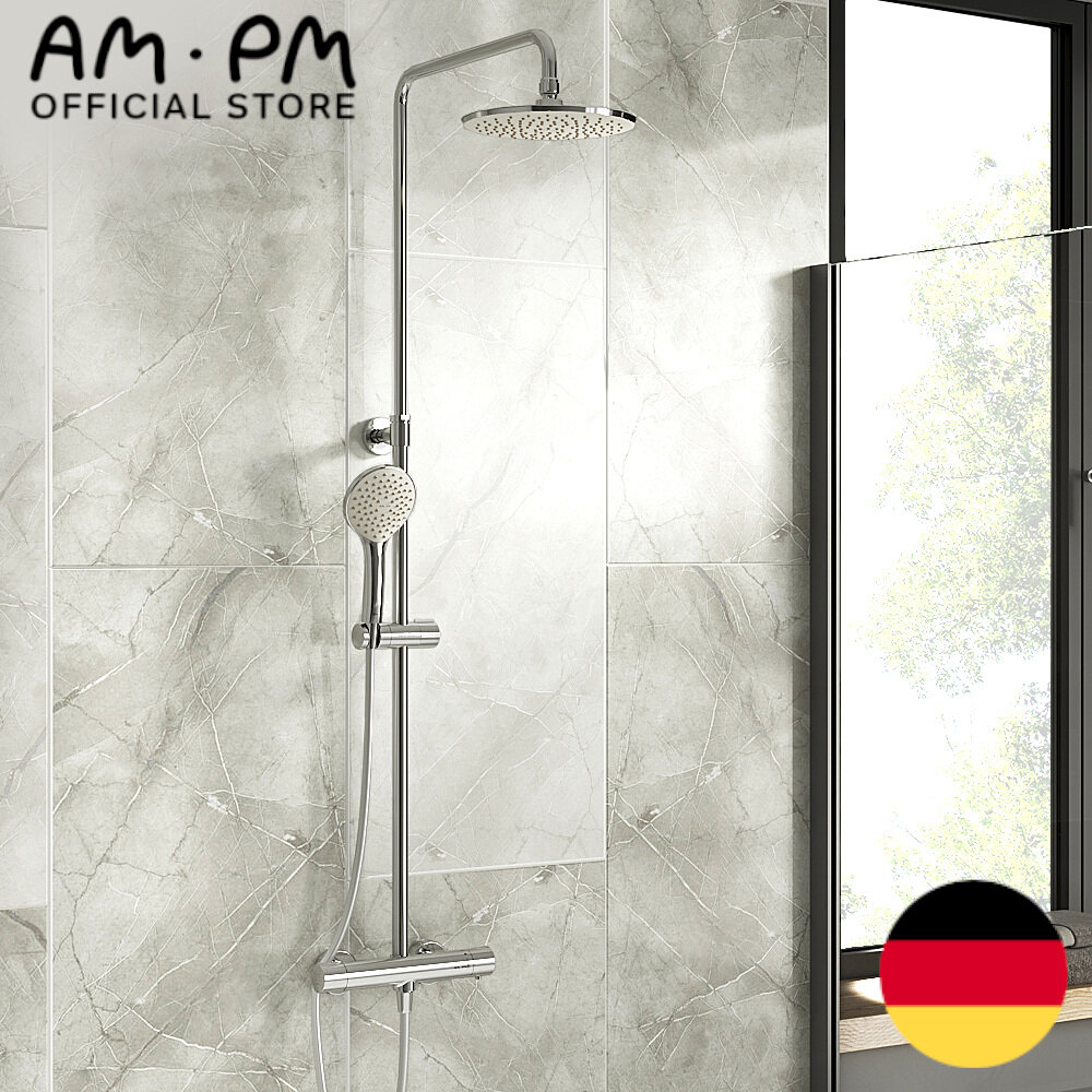 Купить Душевая система с тропическим душем хром AM.PM Jump, душевые системы для ванны, без смесителя, термостат со стопором безопасности, поворотный верхний душ 220мм, лейка 110мм, регулируемая по высоте штанга