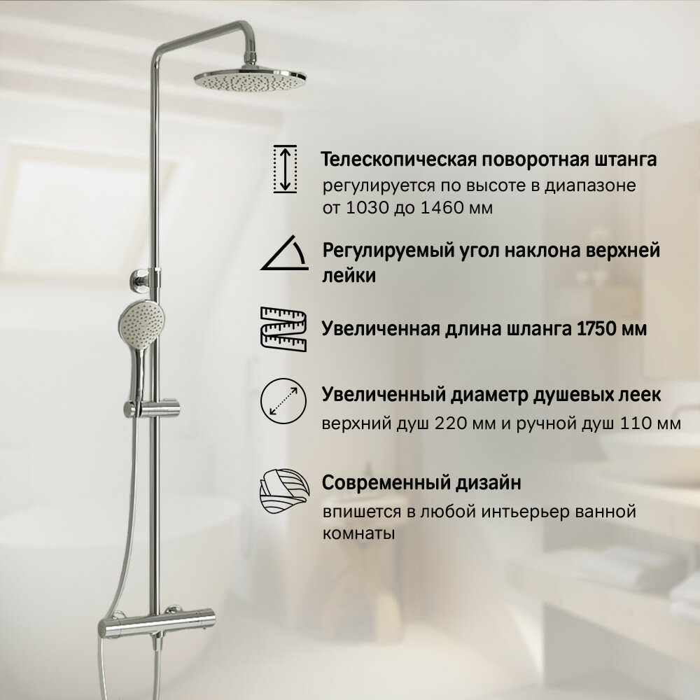 Душевая система с тропическим душем AM.PM Jump F0772410 термостат со стопором безопасности, верхний душ 220мм, лейка 110мм, регулируемая штанга