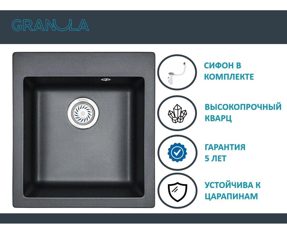 Мойка для кухни врезная кварц GRANULA 46.5x51x20 Кухонная раковина в комплекте с сифоном. Цвет черный металлик