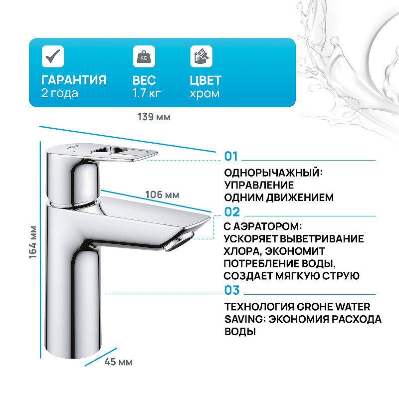 Смеситель для раковины Grohe BauLoop EcoJoy 23917001 хром