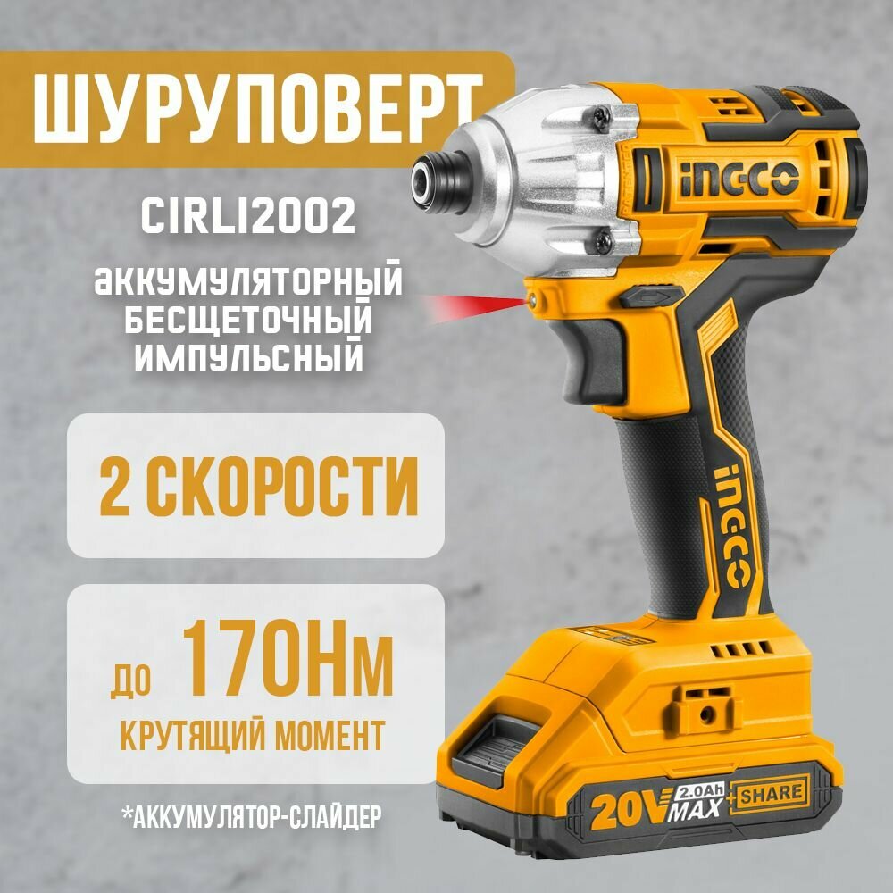 Шуруповерт INGCO CIRLI2002 импульсный бесщеточный Li-lon 20.0 В, 2 АКБ 2 Ач, 170Нм, патрон 1/4