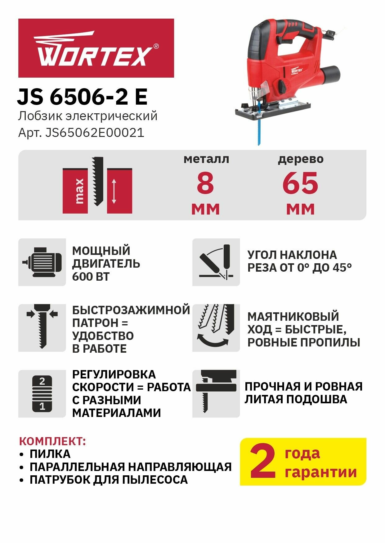Лобзик WORTEX JS 6506-2 E, 650 Вт