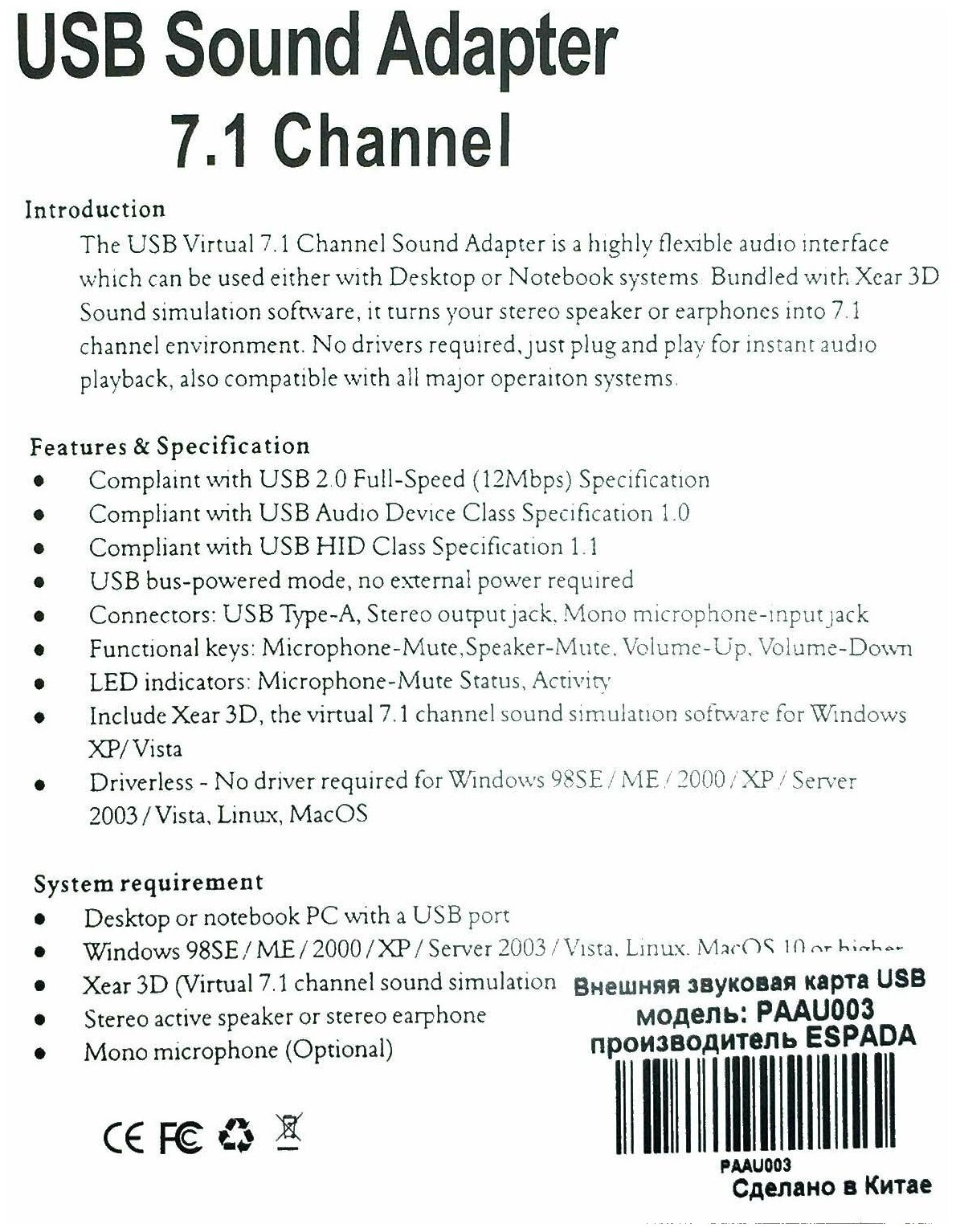 внешние звуковые карты Espada PAAU003 .