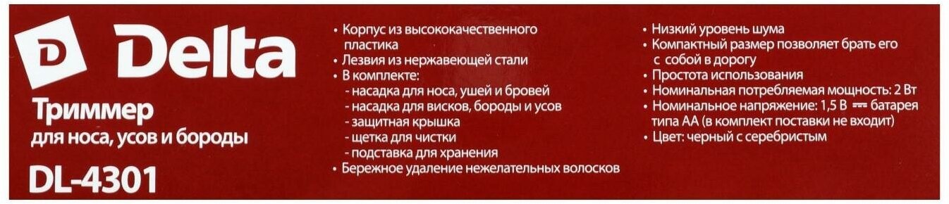 Триммер DELTA DL-4301, для ушей/бороды, 2 Вт, 2 насадки, серебристо-чёрный Delta 7011957 .