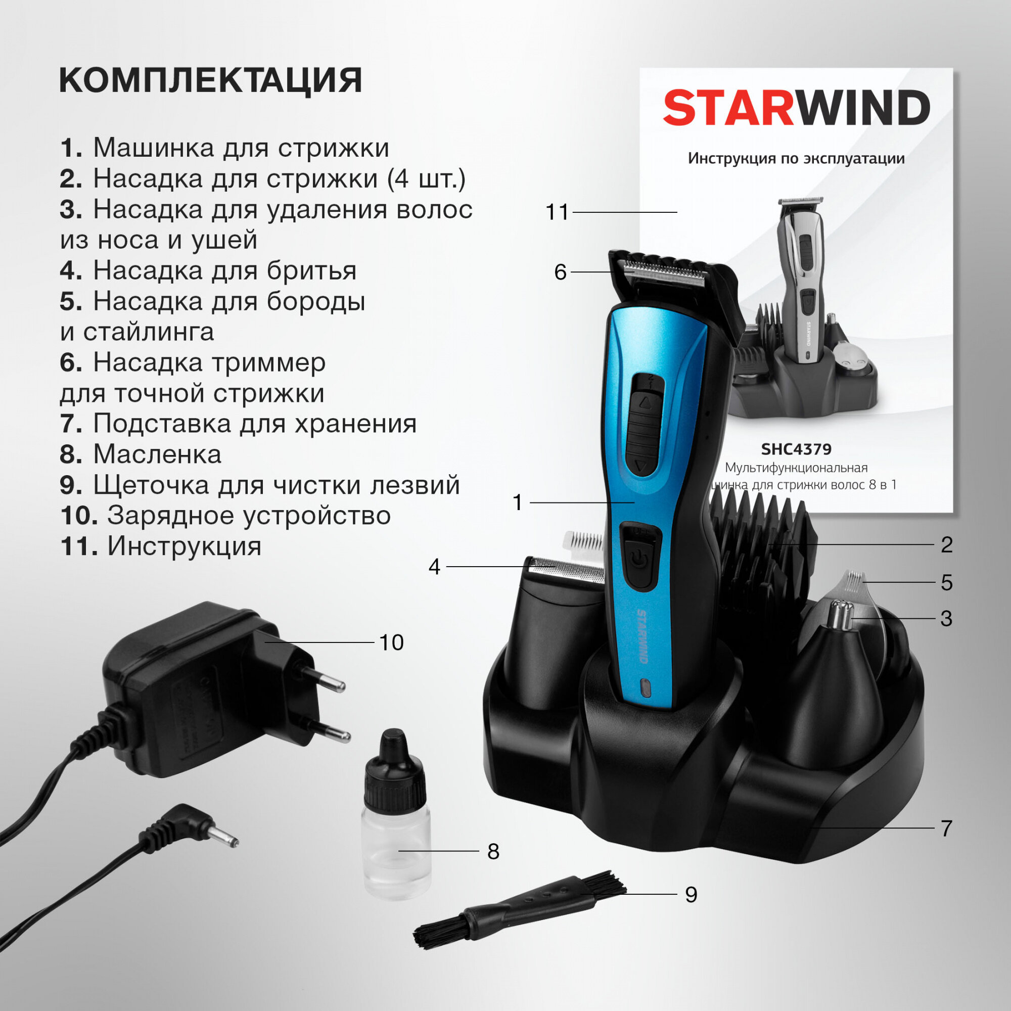 Машинка для стрижки Starwind SHC 4379 синий/черный 3Вт (насадок в компл:8шт)