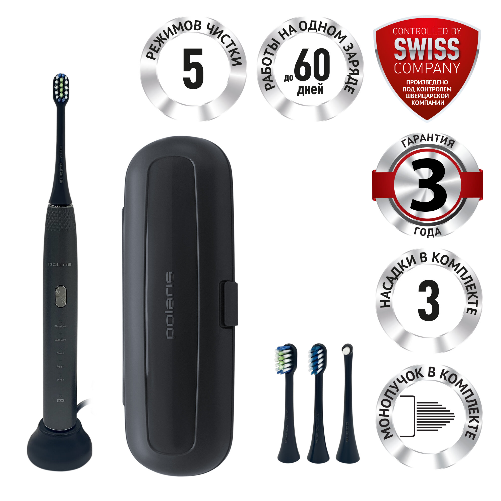 Электрическая зубная щетка Polaris PETB 0701 TC, с дополнительными насадками, графитовая