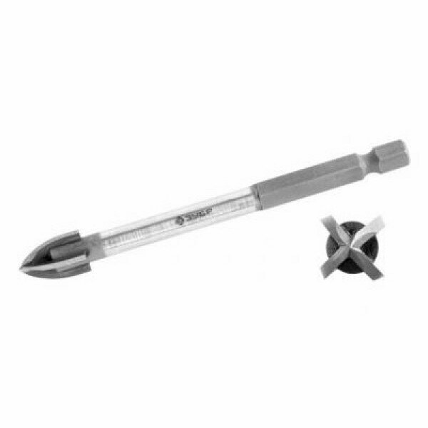 Сверло по кафелю, керамике, стеклу Зубр "Профессионал" 29845-06, с четырьмя режущими лезвиями, шестигранный хвостовик, 6 мм