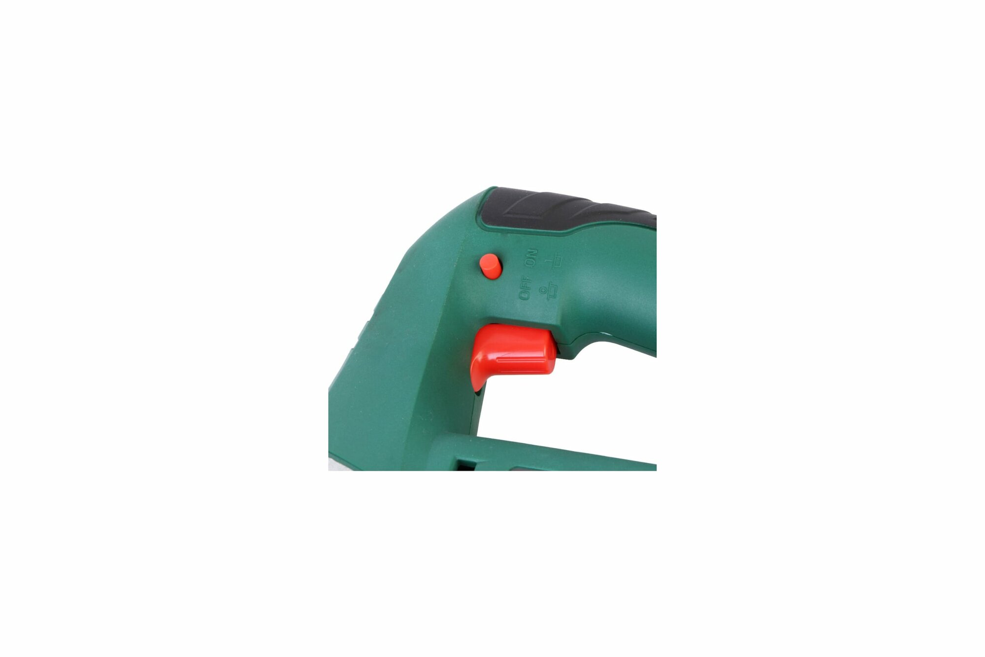 Кнопка включения имеет фиксатор,удобно. Есть в комплекте одна пилка,естественно никакая,но приятно.так же есть запасные контакты на мотор, это внушает доверия, что когда то они износятся и можно поставить запасные. Провод умеренно длинный,плотный на свою мощность с запасом. Вилка норм. Есть ключ для установки пилки |
