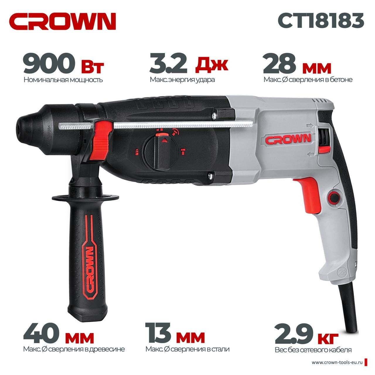 Перфоратор CROWN CT18183 BMC, Мощность 900 Вт, Энергия удара 3,2 Дж