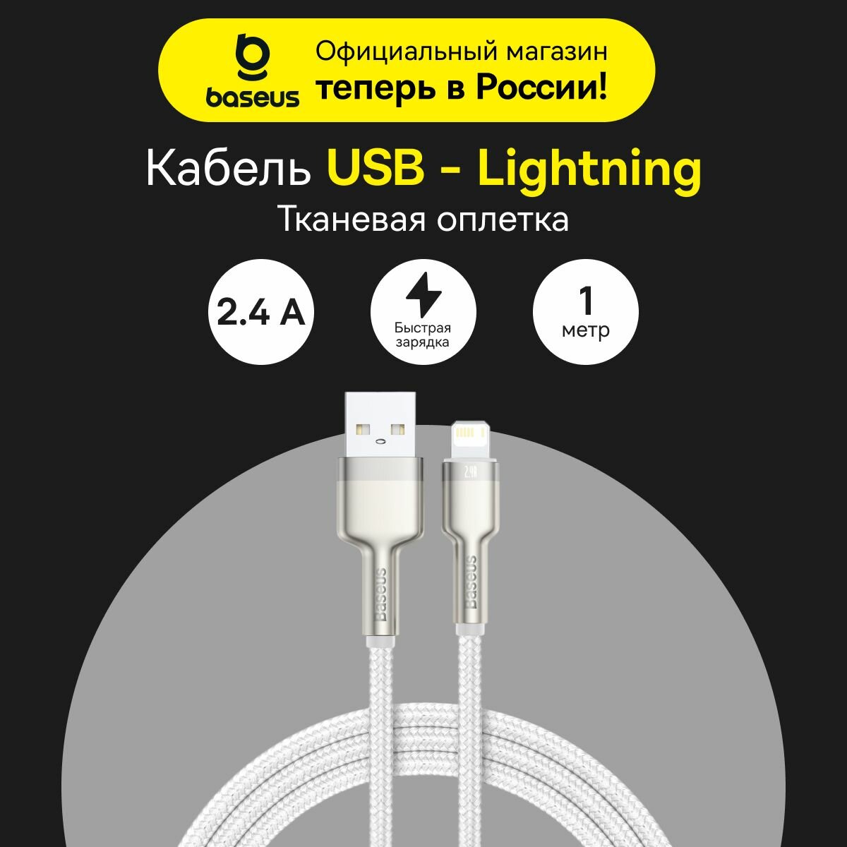 Кабель для айфон USB BASEUS Cafule Series Metal USB - Lightning, 2.4А, 12W, 1 м, белый