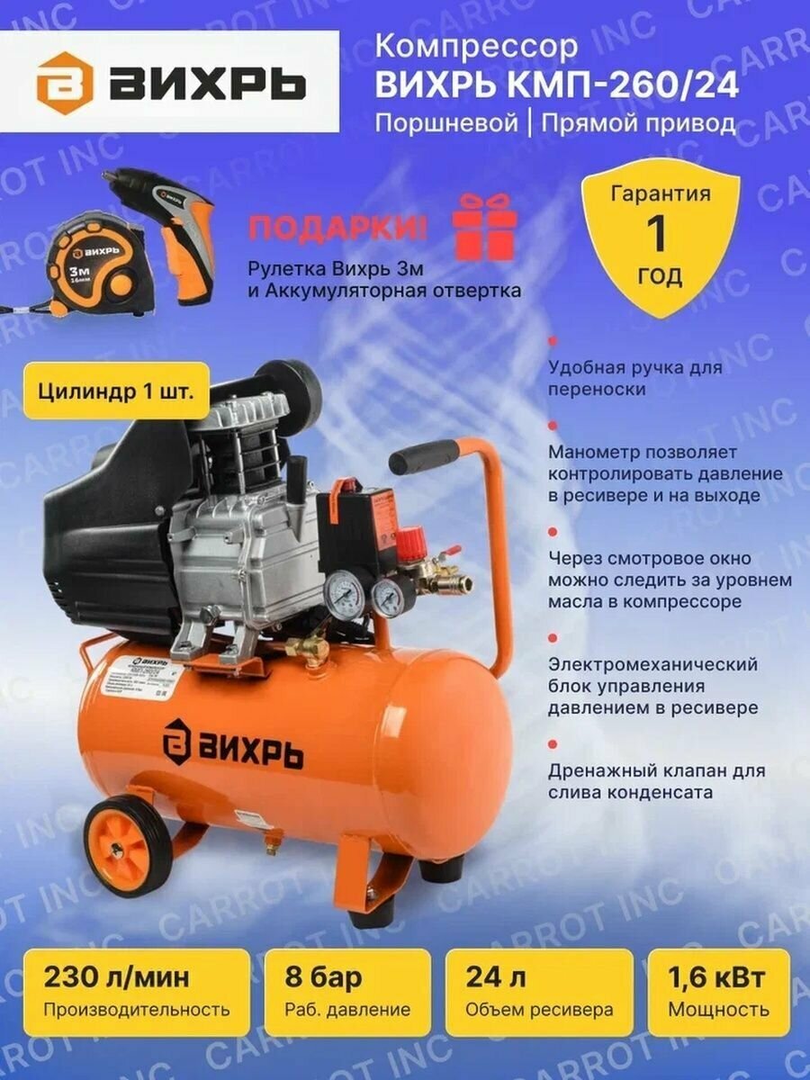 | Отзыв: | Сегодня приобрел Компрессор ВИХРЬ КМП-260/24.