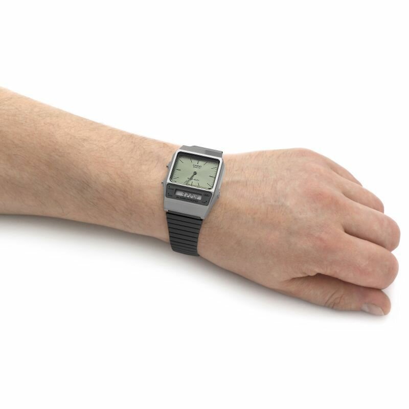 AQ-800E-3A Casio наручные часы кварцевые WR30 (3 атм) мужские, женские серебряный, зеленый секундомер будильник отображение числа, второй часовой пояс, отображение дня недели, отображение месяца акриловое стекло