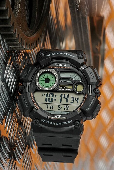 | Дополнительная информация | Светодиодная подсветка. Отображение данных о луне. Таймер рыбалки. Дополнительный циферблат мирового времени. Функция секундомера- 1/100 сек. - 24 часа. Таймер - 1/1 мин. - 24 часа (с автоматическим повтором). Будильник с тремя многофункциональными звуковыми сигналами. Функция повтора будильника. Включение/выключение звука кнопок. Автоматический календарь. 12/24-часовое отображение времени. Время работы аккумулятора 10 лет |