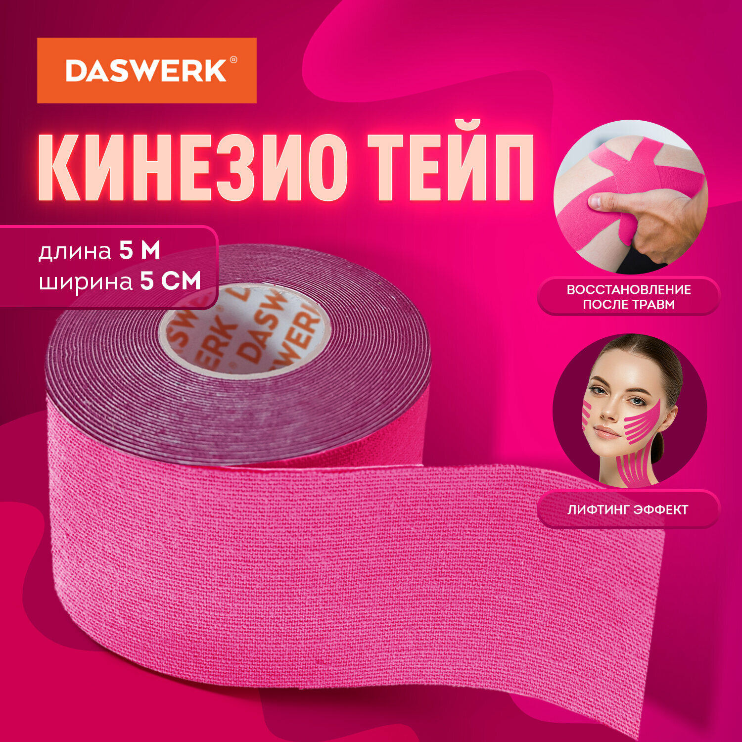 Кинезио тейп/лента для лица и тела, омоложение и восстановление, 5 см х 5 м, розовый, DASWERK, 680004 В комплекте: 1шт.