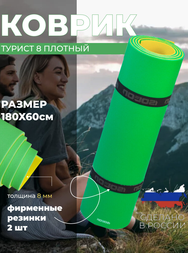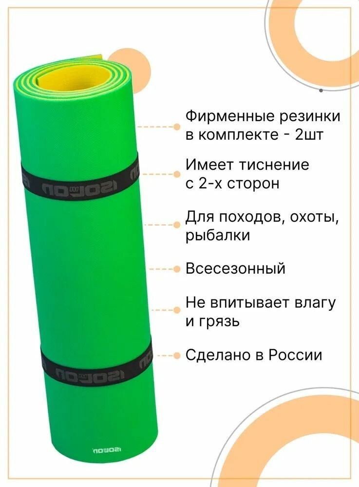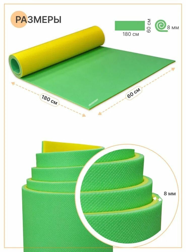Коврик для туризма и отдыха классический Isolon Tourist 8 мм, 180х60 см зеленый/жёлтый