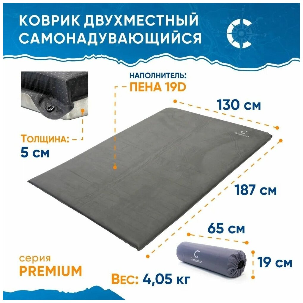 Коврик следопыт Premium, самонадувной, двухместный, толщина 5 см, 187х130 см