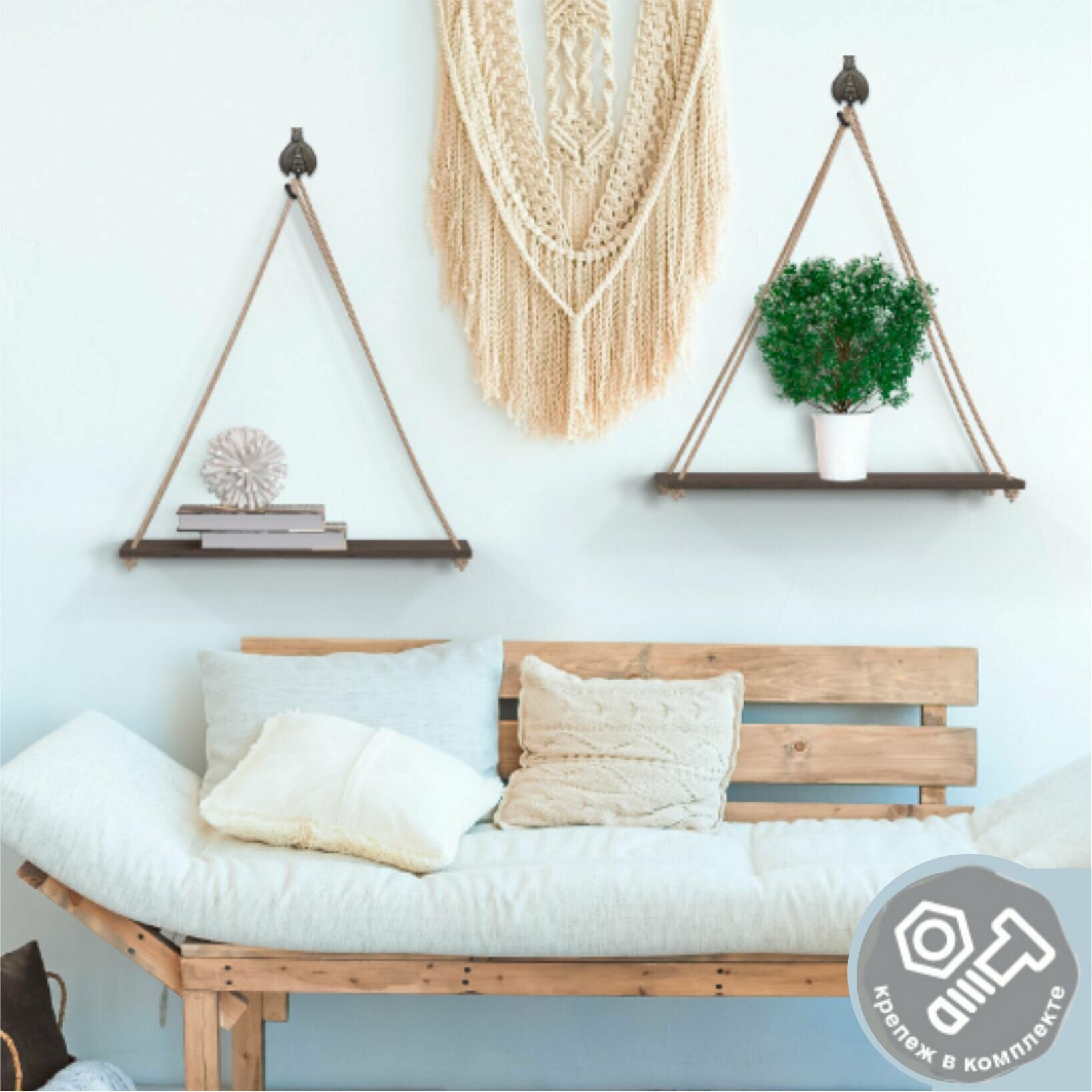 Комплект/набор полок на канатах Budva подвесные/настенные/для книг/для цветов/деревянные 43*13*, толщина 1 см, 2шт, "QWERTY"