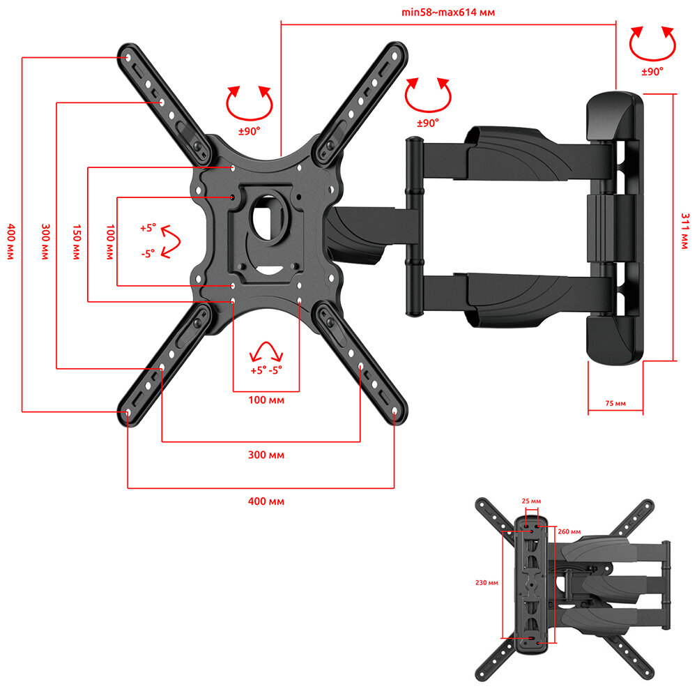 | Стандарт Vesa | 100x100 мм / 200x100 мм / 300x200 мм / 200x200 мм / 300x300 мм / 400x200 мм / 400x400 мм |