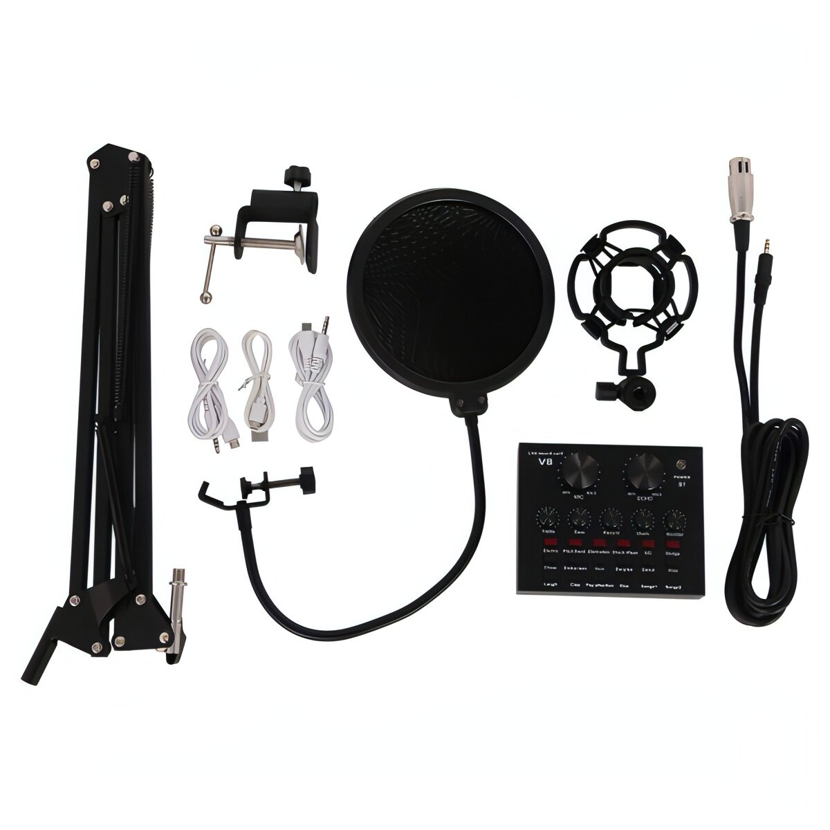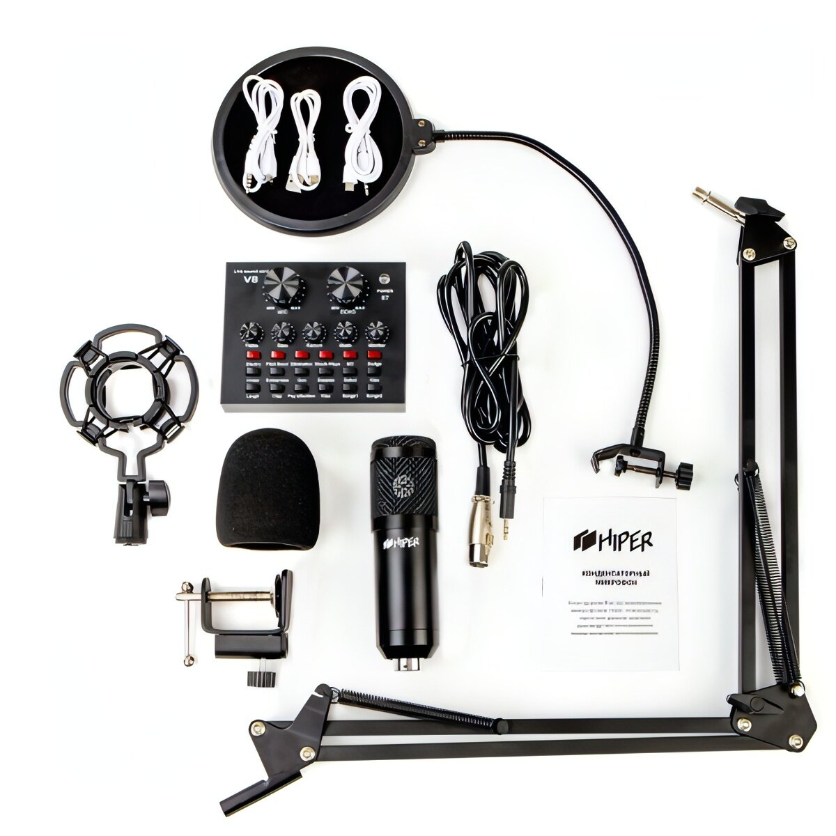 Микрофон HIPER Condenser microphone with metal body, cantilever bracket, metal shock absorber, plastic filter, microphone cover, jack - xlr 1,5m, user manual, V8 sound card