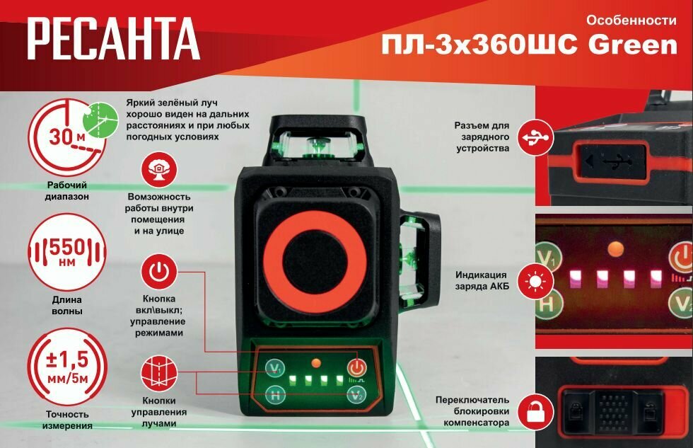 Построитель лазерный Ресанта ПЛ-360, красный, черный
