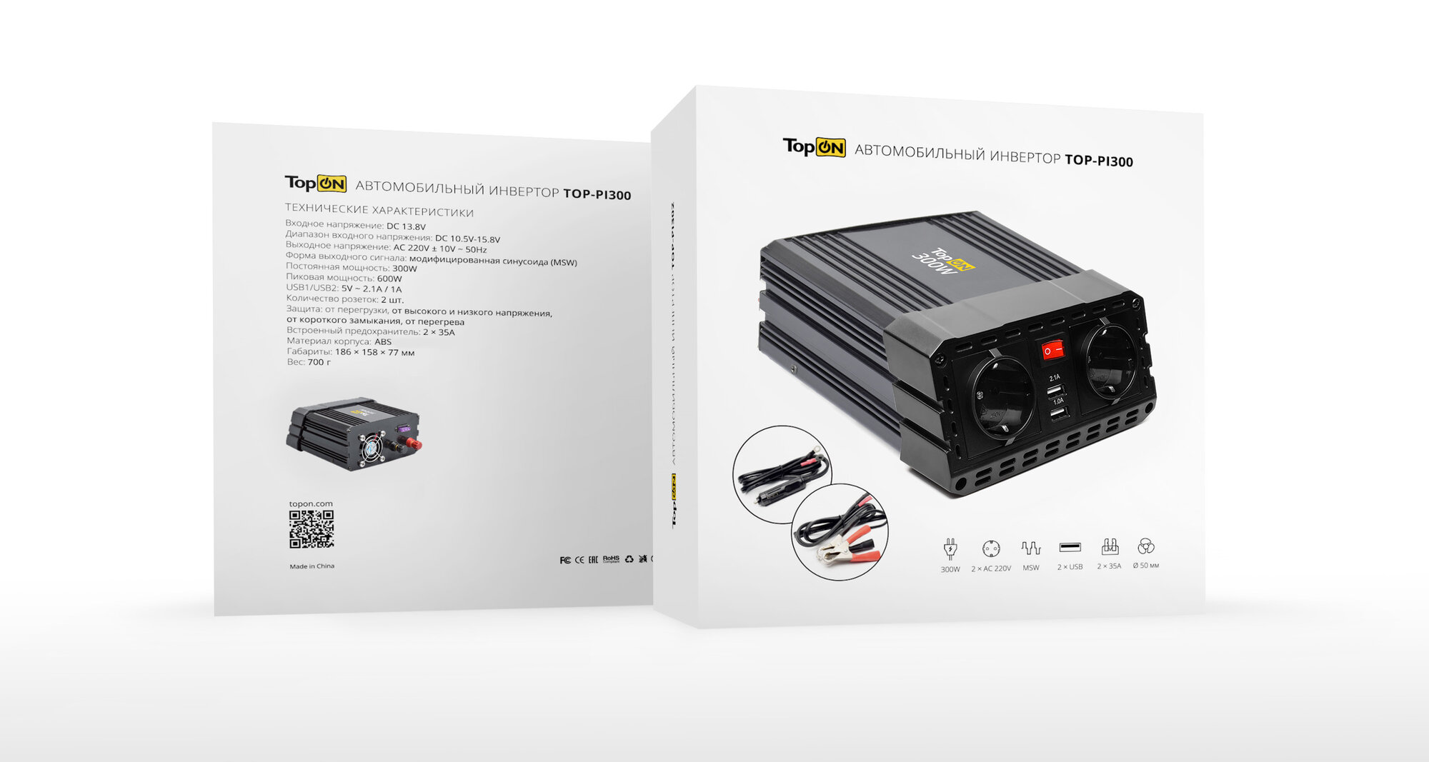 | Комплектация | Автомобильный инвертор TopON TOP-PI302 300W 2 розетки, 2 USB, пиковая мощность 600W Черный |