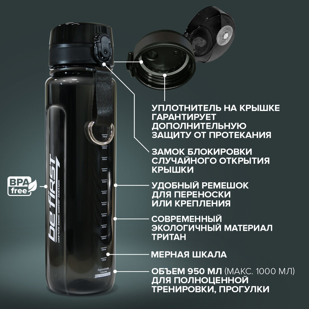Бутылка для воды Be First 950 мл тритан, крышка С защитой, черная (BF16020-BLACK)