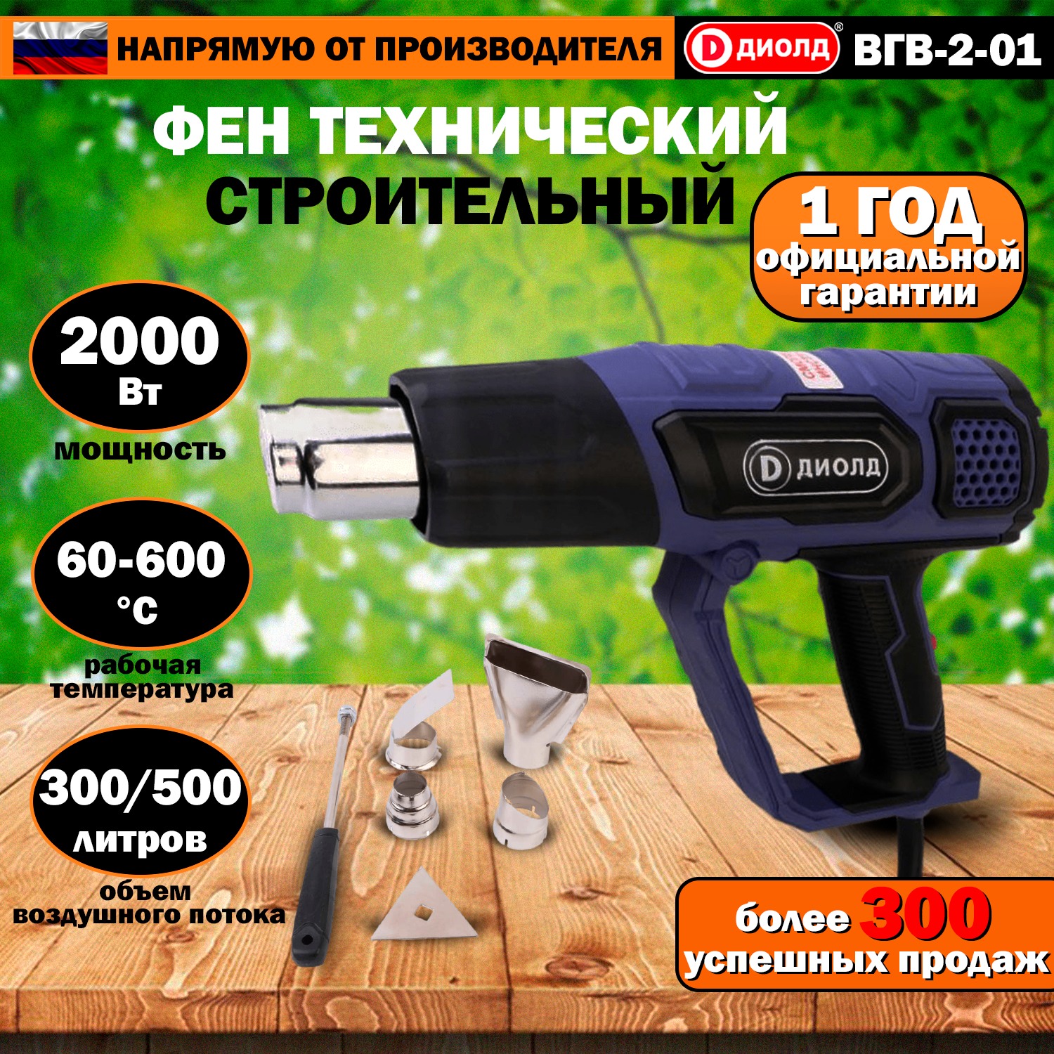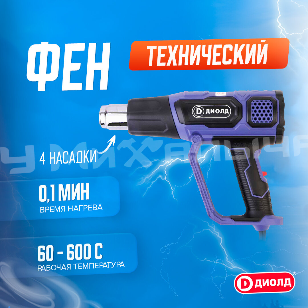 Фен строительный технический диолд ВГВ-2-01, 2000 Вт, плавное изменение температуры, 4 насадки, 60-600 градусов, производитель Россия