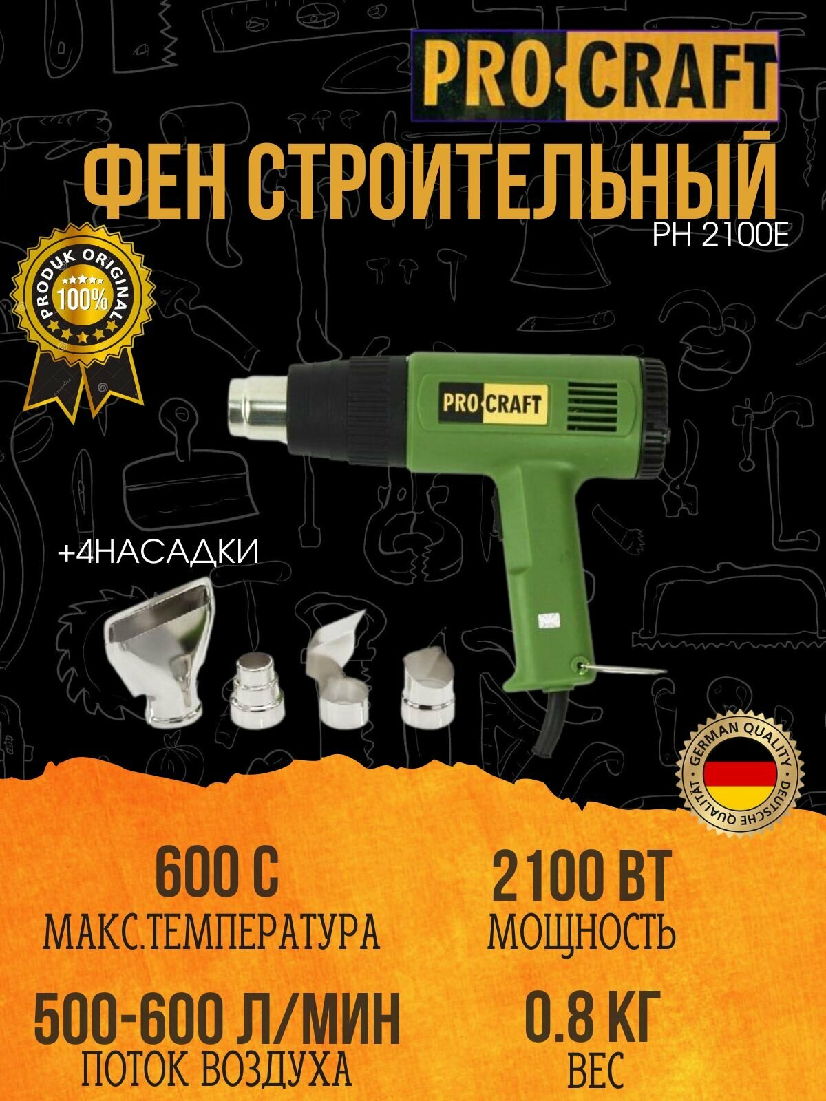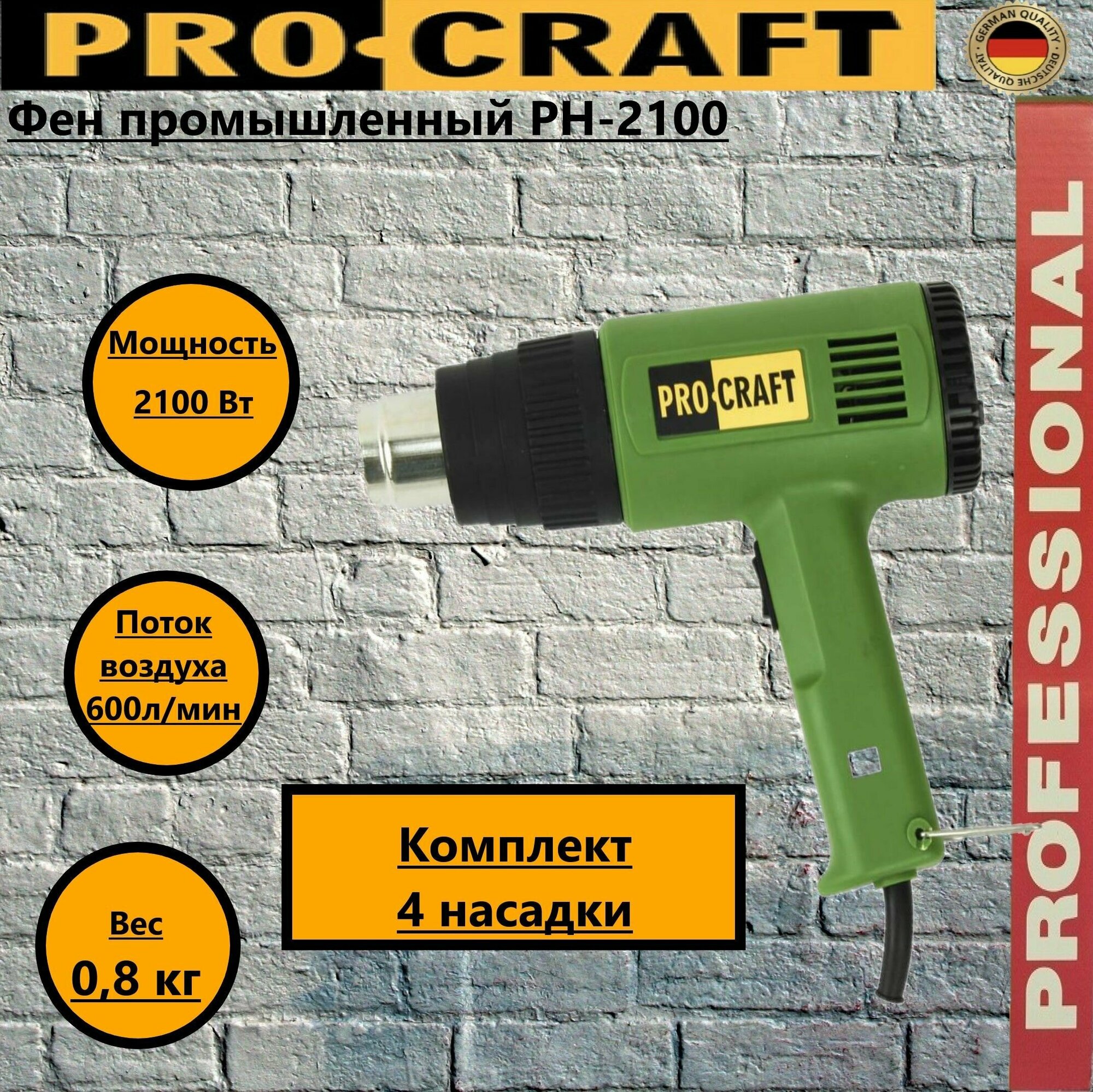 Фен промышленный ProCraft PH2100, 4 насадки, 600 градусов, 2100Вт, 600л/мин