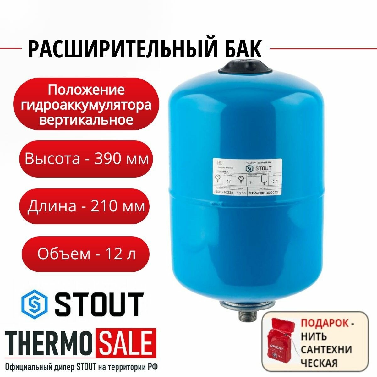 Расширительный бак, гидроаккумулятор 12 л. вертикальный (цвет синий), STOUT STW-0001-000012