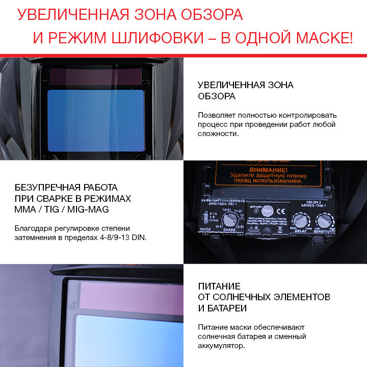 | Отзыв: | Область обзора 100 на 65 мм. 3 режима светопропускания (можно даже работать с УШМ в маске) питание фильтра от литиевой батарейки и солнечного элемента. |